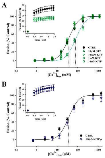 Synergistic effects between Ca2+ and GTP have been observed in different models of regulated secretion. While the only requirement for CV–CV fusion is an increase in [Ca2+]free [53], GTP may modulate the efficiency of exocytosis. To explore this possibility, BIM media (without ATP) was supplemented with GTP or GTPγs immediately prior to fusion assays. While low concentrations had no effect on fusion, high concentrations of the nucleotide decreased the Ca2+ sensitivity and rate of CV–CV fusion (Figure 5A). Treatment with 10 mM GTP resulted in a rightward shift in EC50 from 37.1 ± 4.4 µm [Ca2+]free under control conditions to 78.6 ± 13.3 µm [Ca2+]free (n = 6; p ≤ 0.01). Initial fusion kinetics were also inhibited in response to 33.7 ± 2.7 µm [Ca2+]free (n = 3; p ≤ 0.05), but not at higher [Ca2+]free. The addition of a nonhydrolyzable analogue GTPγS did not reduce the concentration of nucleotide required to inhibit fusion (n = 4) (Figure 5B). Furthermore, lengthening the incubation time to 30 min at 25 °C with GTP or GTPγS did not increase the potency of inhibition (data not shown).