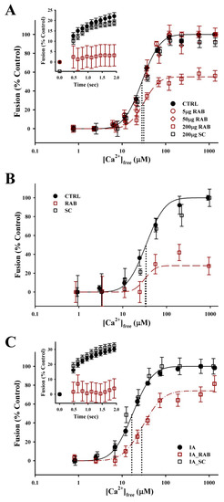 While no effect on Ca2+-sensitivity was observed with the addition of RAB peptide alone, we tested for an interaction between thiol treatment and Rab GTPase function. CVs were pretreated with 20 mM IA for 20 min which resulted in a typical leftward shift in EC50 (Figure 6C). Following the washout with IA, CVs were treated with 200 µg/mL of the RAB effector domain peptide or 200 µg/mL of the scrambled peptide, in the presence of GTPγS, for 30 min. Treatment with the RAB peptide shifted the EC50 rightward back toward that of naïve, untreated CV (IA EC50 = 16.7 ± 2.6 µm versus IA_ RAB EC50 = 28.2 ± 5.3 µm; n = 5; p = 0.0865). The extent of fusion in CV pretreated with IA followed by treatment with RAB peptide was 74.6% ± 19.2%. Initial fusion kinetics were also inhibited in response to 48.5 ± 6.6 µm [Ca2+]free (n = 4; p ≤ 0.05). The Ca2+ sensitivity, kinetics or extent of fusion in CV pretreated with IA followed by treatment with scrambled peptide did not differ from the IA pretreatment condition.