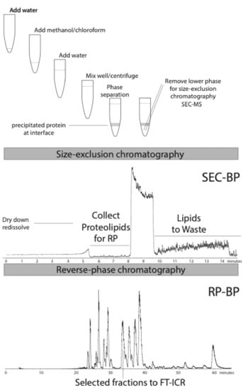Schematic diagram of extraction of spinach thylakoid membrane proteolipids followed by size-exclusion and reverse-phase chromatography. Chloroform extraction selectively captures lipids and proteolipids in the lower chloroform-enriched phase. This lower phase is then injected to size-exclusion chromatography in order to separate proteolipids from lipids. Proteolipid-containing fractions are dried, redissolved in 70% formic acid and run on reverse-phase (RP) chromatography with low-resolution electrospray ionization mass spectrometry and fraction collection (LC–MS+). Selected fractions are then subject to top–down Fourier-transform ion cyclotron resonance (FT-ICR) MS offline using nano-electrospray ionization. Representative base peak (BP) chromatograms for size-exclusion chromatography (SEC) and RP are shown. The SEC-BP chromatogram shows dropout of signal as the proteolipid peak is collected and again as the bulk of the lipid peak is diverted to waste.