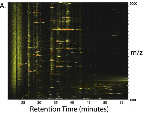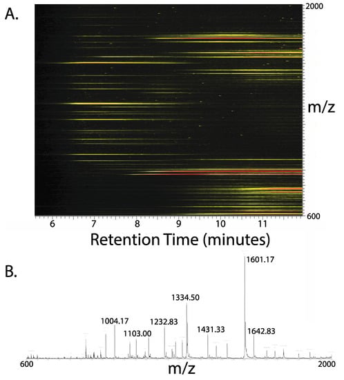 Lipid extractions into chloroform from biological membrane systems were described by Folch [] and Bligh and Dyer []. A variant is the chloroform/methanol/water protocol used as described by Wessel and Flugge [] specifically to precipitate proteins away from detergents. Many membrane proteins are precipitated along with soluble proteins at the aqueous/organic interface. The lower phase was collected with a stainless steel/glass (Hamilton-type) syringe and stored at 4 °C for a maximum of 24 h prior to further chromatography (the lipid/proteolipid mixture is susceptible to oxidation and plasticizer contamination if stored longer). Aliquots (100 µL) were injected onto a size-exclusion column as described (see Figure 1). The proteolipid peak was diverted to collect these proteins and the later eluting lipids were diverted to waste (see base peak chromatogram shown for SEC) (Figure 1). Proteins that precipitate in the Wessel and Flugge procedure (see Figure 1) can be dissolved in formic acid and crudely separated by the same size-exclusion chromatography (SEC) method [,]. Figure 2A shows a 3D ion map chromatogram that emphasizes elution of proteins (6–8 min) versus lipids (>8 min). Figure 2B shows the mass spectrum of the proteolipids. Deconvolution of the multiple signals of unclear charge performed quite poorly (not shown), emphasizing the need to further separate these species or use high-resolution mass spectrometry to reveal charge state. The strongest signals at m/z 1334.5 and 1601.17 correspond to the 6- and 5-charge states of the ATP synthase c-subunit of molecular weight 8002 Da that consists of residues 1–81, with retention of the initiating formyl methionine residue (calculated average mass 8002.4 Da), as we previously described [].