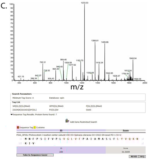 - Gomez, S.M.; Nishio, J.N.; Faull, K.F.; Whitelegge, J.P. The chloroplast grana proteome defined by intact mass measurements from liquid chromatography mass spectrometry. Mol. Cell. Proteomics 2002, 1, 46–59. [Google Scholar] [CrossRef]