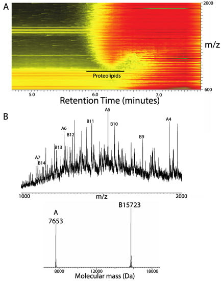 Extraction of spinach thylakoid membrane proteolipids. (A) A 3D ion map view of the size-exclusion separation of chloroform-extractable lipids and proteolipids. (B) Mass spectrum of multiply charged proteolipid ions averaged from 6.4 to 7.8 min. A deconvolution was not included because several small proteolipids were represented by a single charge only confounding the software.