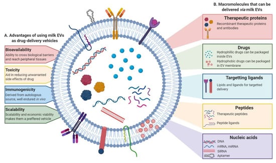 Milk EVs can be engineered to be used as drug-delivery system. Schematic representation of the (A) advantages of using milk EVs as drug-delivery system and (B) macromolecules that can be packaged and delivered via milk EVs. The nanosized vesicles, other than their intrinsic cargo, can also serve to deliver a variety of molecules including chemotherapeutic and anti-inflammatory drugs, recombinant proteins, peptides and nucleic acids. These EVs can be engineered to target specific sites of interest with the help of targeting ligands and lipids on their surface.