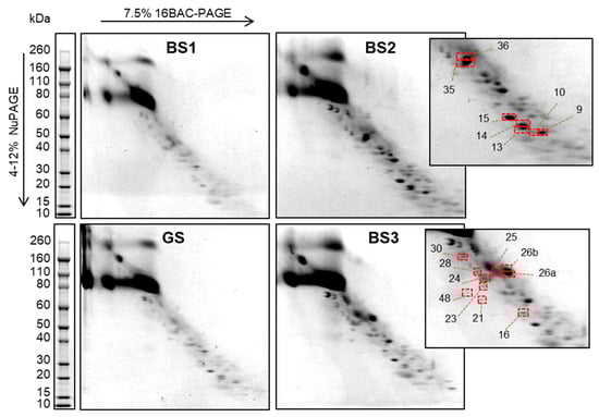 uEV protein profile by two-dimensional (2D) diagonal electrophoresis. Protein separation of uEV from Gitelman Syndrome (GS), Bartter type 1 (BS1), Bartter type 2 (BS2) and Bartter type 3 (BS3) patients by 16-BAC-PAGE/SDS-PAGE and Blue Coomassie staining. In the right panels, the selected spots from BS2 (upper) and BS3 (lower) are highlighted by red rectangles.