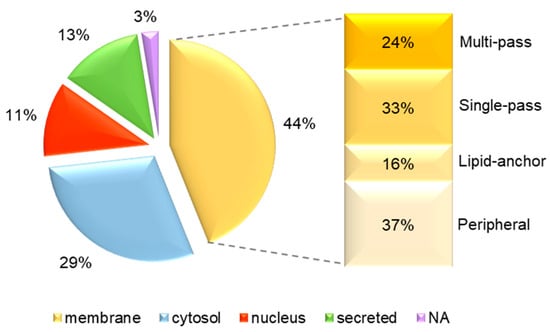 MS analysis identified 167 different protein species, 19 of which in both BS2 and BS3 uEV (Table 2 and Table S1). The lists of proteins identified in each spot are reported in Tables S2 and S3). Keratins were excluded as they are common contaminants in LC-MS/MS data. Moreover, we decided to not include peptides derived from uromodulin. Proteins that were recovered in more than one spot were counted only once. Even if only a few spots were analysed, we can consider them as roughly representative of the whole uEV proteomes separated by the diagonal electrophoresis, because they were chosen without pre-determined criteria except the differential intensity between two patient groups. The results show that the most represented subcellular location is membrane (44%) (Table S4): inside this group, the transmembrane proteins (single pass + multi pass) are the most abundant, presenting more than 55% (Figure 2). This suggests that the 16-BAC/SDS-PAGE is also able to enrich for membrane proteins in the case of uEV, which, to our knowledge, have never been analysed by this method.