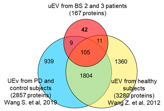 Venn diagram. Comparison of proteins identified in the partial proteome of uEV from BS2 and BS3 patients and the whole proteome of uEV from healthy subjects [] and Parkinson’s disease patients and healthy controls [].