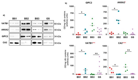 uEV content of the proteins of interest. (a) Immunoblotting of GIPC2, CA2, VATB1 and ANXA2 in uEV fraction of GS, BS1, BS2 and BS3 patients (two representative cases for each group are shown). Equal amounts of proteins were loaded on all lanes of each gel. (b) Densitometric analysis of protein signals normalized by mg of uEV proteins. Scatter plot of all patient data. Statistical analysis: red asterisks represent Kruskal-Wallis multivariate analysis, * p-value < 0.05; *** p-value < 0.001; **** p-value < 0.0001; black asterisks represent Mann-Whitney t-test: * p-value < 0.05; ** p-value < 0.01; *** p-value < 0.001.
