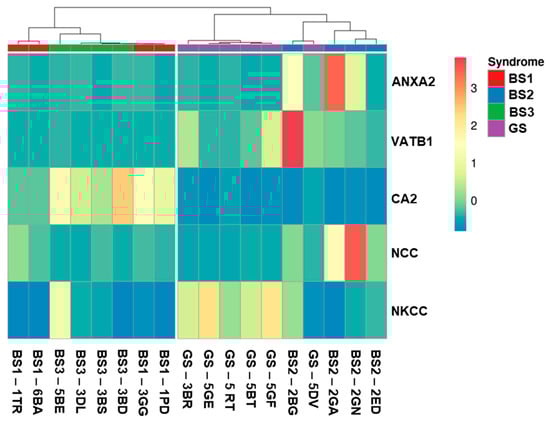 After performing a multivariate analysis, we were able to provide an expression pattern as a heatmap representation (Figure 5). The best results were obtained including the relative uEV abundance of CA2, VATB1, ANXA2, along with NCC and NKCC2. For this reason, only patients for whom we had all these protein values were included in the heatmap. By using this protein panel, BS1 and BS3 cluster separately from GS and BS2, this allows a clear discrimination between BS1 and BS2 and between BS3 and GS.