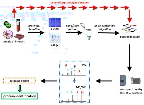 A typical bottom-up proteomics workflow (Figure 1) consists of several major steps: (i) isolation of the protein mixture from the studied biological sample, followed by (ii) quantification of isolated proteins concentrations (e.g., Bradford assay), then (iii) fractionation of proteins by gel electrophoresis or liquid chromatography methods. After fractionation, (iv) the proteins are proteolytically cleaved by enzymes (usually trypsin); followed by (v) a mass spectrometric measurement of the resulting peptides and (vi) a database search for protein identification.