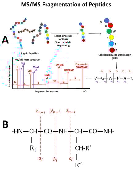 Correspondence between the peptide’s amino acid sequence and the fragment ion peaks that are produced in MS/MS (A) and the major theoretical fragment ions that are produced from fragmentation of a peptide (B).