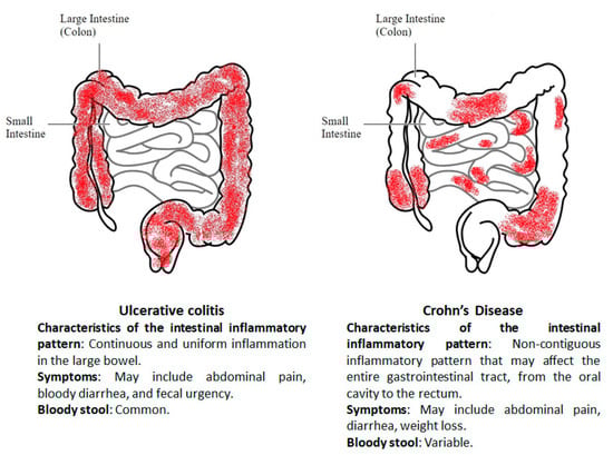 Indeed, while UC is characterized by a continuous inflammation, limited to the colon mucosa and submucosa, without involving the small bowel [2,3,4,5], CD is a transmural disorder characterized by a non-contiguous inflammatory pattern that may affect the entire gastrointestinal tract, from the oral cavity to the rectum (Figure 1) [6,7]. The CD’s primary clinical symptom is abdominal pain with weight loss; it can also present with extra-intestinal co-morbidities similar to those described in UC patients; however, CD patients may also present peri-anal complications (abscesses, fistulas, and strictures) [6].