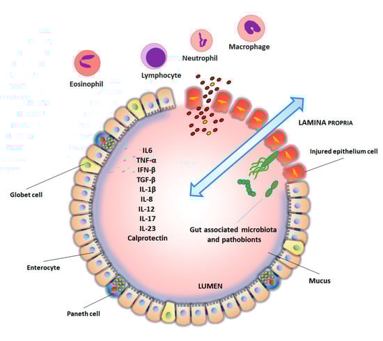 Under homeostatic conditions, a single layer of enterocytes represents an efficient physical, chemical and electrical barrier against luminal microbial community’s invasion but, when the integrity of the epithelium is compromised, luminal antigens, including pathobionts can translocate into the subepithelial compartment thus triggering and/or sustaining a dysregulated inflammatory immune responses [11,12]. The inflammatory trigger activates the synthesis of pro-inflammatory chemokines (chemoattractants) by epithelial cells with a robust influx of neutrophils into the tissue within hours of the damage [9]. Moreover, during the acute period of the inflammatory response, the mucosal milieu is enriched in inflammatory cytokines, metabolites of arachidonic acid and other pro-inflammatory mediators that activate the recruited leukocytes [9]. Once the inflammatory response has started, TNF-α, IL-1β, and other pro-inflammatory leukocyte products amplify the inflammatory response in a vicious circle can further damage the intestinal mucosa integrity (Figure 2).