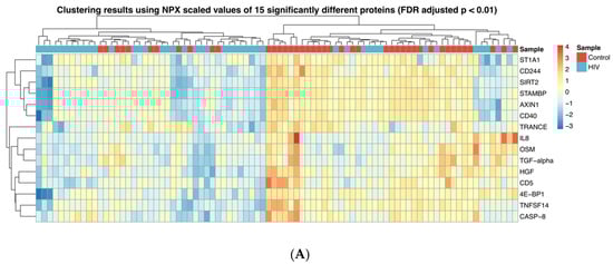 Inflammatory protein profiles in HIV-1-infected children and controls; (A) Heatmap showing the expression of 15 proteins where abundance was significantly reduced (p < 0.01, FDR adjusted) in HIV-1-infected children compared to controls. (B) Box plots showing the abundance of three proteins upregulated in HIV-1-infected children compared to controls. * p < 0.05; ** p < 0.01.