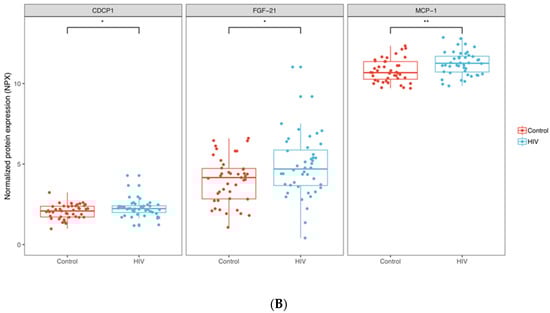 - De Filippi, C.; Toribio, M.; Wong, L.P.; Sadreyev, R.; Grundberg, I.; Fitch, K.V.; Zanni, M.V.; Lo, J.; Sponseller, C.A.; Sprecher, E.; et al. Differential plasma protein regulation and statin effects in Human Immunodeficiency Virus (HIV)-infected and non-HIV-infected patients utilizing a proteomics approach. J. Infect. Dis. 2020, 222, 929–939. [Google Scholar] [CrossRef]