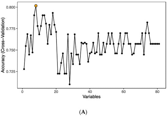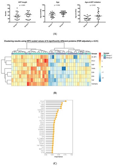 The abundance of eight proteins—4E-BP1, CCL4, HGF, TNFB, CD6, CD5, TNF and TNFRSF9—was significantly different between the two HIV-1-infected groups (p < 0.01, FDR adjusted), with all proteins detected at lower abundance in children who started ART at a later time point. Hierarchical clustering based on the eight proteins almost completely coincided with the grouping according to age of ART initiation (Figure 4B). One cluster consisted of 19 samples with 16 of them belonging to group 1 and the other cluster of 22 total samples with 16 pertaining to group 2. RF classification performed with the highest accuracy (78.5%, AUC-ROC = 78.4%) using 35 proteins as predictors of which the 30 most significant are shown (Figure 4C); CCL4 was found to be the most critical protein for successful classification with its abundance higher in the group initiating ART at a younger age.