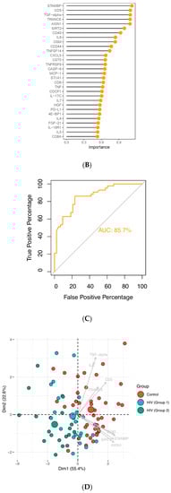 In order to pin-point proteins discriminating between groups, we performed random forest (RF) analysis using the 82 detected factors on the inflammation panel. The analysis identified eight predictors (TRANCE, STAMBP, AXIN1, CD5, TFG-α, SIRT2, CD40 and IL-8; p < 0.05) that could classify samples into groups with an accuracy of 80.2% (Figure 2A); all eight proteins were found to be downmodulated in the infected group. The ranking of random forest prediction factors comprising 82 proteins was performed and the top 30 prediction factors are shown according to their relevance for treated HIV-1 infection (Figure 2B). The classification model performance was formally tested using area under the receiver operating characteristic curve (AUC-ROC), yielding an AUC value of 85.7% (Figure 2C). Principal component analysis (PCA) performed using the RF predictors and subsequent k-means clustering showed that although the individual specimens of the groups failed to form well defined clusters, the mean values of the three groups were spatially distinct with the HIV-1 group 1 positioning closer to the control group (Figure 2D).