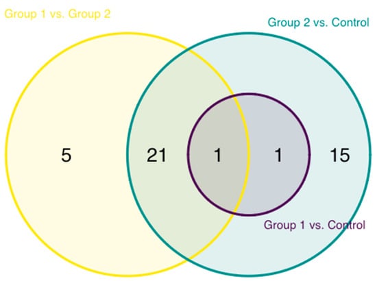 A pairwise comparison of the abundance of inflammation proteins of the HIV-1-infected groups and uninfected controls was also performed. The greatest level of difference, 38 proteins, was observed between group 2 and control, followed by group 1 vs. group 2 with 27 proteins and group 1 vs. control, where the abundance of only 2 proteins, TRANCE and STAMBP, was found to be significantly different (Figure 3). These two proteins, in addition, constituted an overlapping difference between both HIV-1-infected and control groups.