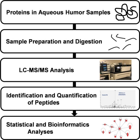 Liquid chromatography/Mass Spectrometry (LC-MS/MS) workflow for proteomic analysis of human aqueous humor. Samples were digested using trypsin and were analyzed using an Orbitrap Fusion Tribrid mass spectrometer coupled with an Ultimate 3000 nano-UPLC system. Proteins were identified and quantified using Proteome Discoverer (ver 1.4; Thermo Scientific, Waltham, MA, USA) followed by statistical analysis using the R Project for statistical computing (https://www.r-project.org/).