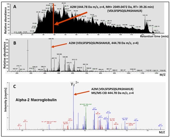 Example of LC-MS/MS analysis of human aqueous humor sample. (A) LC-MS/MS total ion current chromatogram. The retention time (RT) elution of one reporter peptide indicative of A2M protein is marked for illustration purposes. (B) MS spectra of selected precursor peptide 444.78 m/z with a distinct isotopic pattern benefitted from the high resolution of the Orbitrap MS analyzer. (C) MS/MS spectra using collision-induced dissociation (CID) fragmentation of A2M (444.78 m/z) precursor peptide, colored peaks (red for b ions and blue for y ions) indicate matches between experimental and theoretical/calculated values.