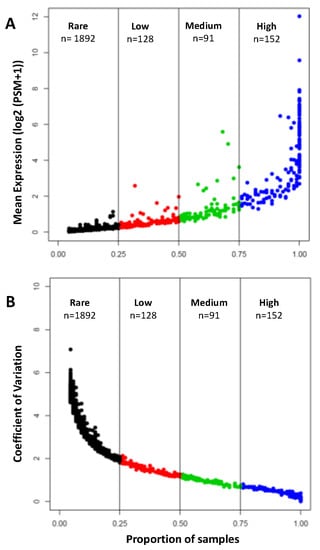 Distribution of the mean values (A) and coefficient of variation (B) of proteins detected in the human aqueous humor samples. The proteins were subdivided into four categories, based on their detection rate. High: detected in >75%; Medium: detected in 50–75%; Low: detected in 25–50%; Rare: detected in <25% of the samples. Coefficient of variation decreases as mean protein expression increases.