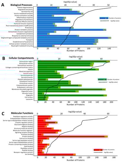 Biological processes (A), cellular components (B), and molecular functions (C) associated with the highly abundant aqueous humor proteins (detected in >50% samples). Bioinformatics analysis was performed in order to associate significantly enriched Gene Ontology (GO) terms to the constitutive aqueous humor proteome. The horizontal bars represent the number of proteins annotated to each GO term, and the black lines represent the p-value of enrichment.