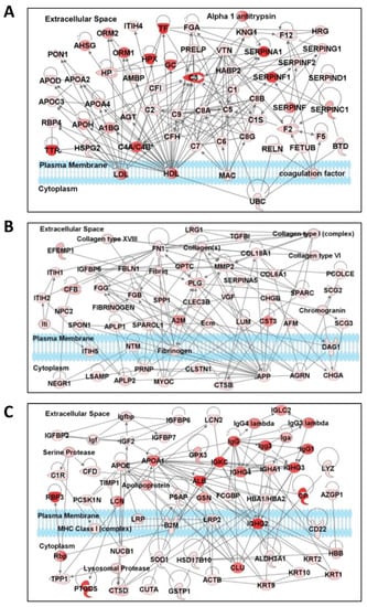 Three top-scoring interaction networks of highly abundant aqueous humor proteins. Ingenuity Pathway Analysis (IPA) was performed on the 243 proteins detected in at least half of the aqueous humor samples. (A) Network 1: includes several members of the Apolipoprotein, Complement, and SERPIN families. (B) Network 2: Network of proteins involved in tissue development, protein synthesis, and cellular compromise. (C) Network 3: Protein cluster associated with humoral immune response, inflammatory response, and protein synthesis. Each protein is represented as a node, and edges represent interactions between proteins. The intensity of color represents the relative levels of proteins (brighter red nodes indicate higher levels). Proteins are separated based on the cellular compartments.