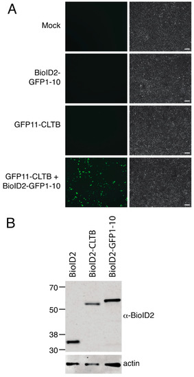 The following are available online at https://www.mdpi.com/2227-7382/8/4/37/s1, Supplementary File 1: Original western and streptavidin blots and quantitation of bands; Supplementary Table S1: Proteins identified by proximity biotinylation with transiently co-expressed GFP11-CLTB and BioID2-GFP1–10 in HEK 293 cells; Supplementary Table S2: Proteins identified by proximity biotinylation with transiently expressed BioID2-CLTB in HEK 293 cells; Supplementary Table S3: Proteins identified by proximity biotinylation with GFP11-CLTB in stable BioID2-GFP1–10 cells; Supplementary Table S4: Proteins with “clathrin” GO terms or that interact with clathrin heavy or light chain.