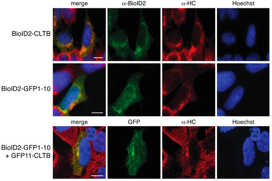 3.1. GFP11-Clathrin Light Chain Recruits Myc-BioID2-GFP1–10 and Colocalizes with Clathrin Heavy Chain