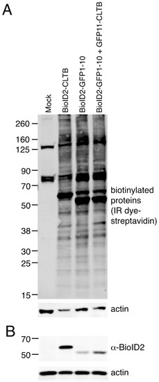 Biotinylation of cellular proteins by Myc-BioID2-GFP1–10 and GFP11-CLTB. (A) HEK 293 cells were mock-transfected or transfected with plasmids encoding Myc-BioID2-CLTB, Myc-BioID2-GFP1–10, or Myc-BioID2-GFP1–10 plus GFP11-CLTB, incubated with biotin and lysed. Samples were subjected to SDS-PAGE, transferred to nitrocellulose membrane, and probed with IRDye® 800CW streptavidin. Actin was stained with anti-actin antibodies as a loading control. (B) Expression of BioID2 in the samples from panel A was confirmed by probing with anti-BioID2 primary antibodies. Actin was stained with anti-actin antibodies as a loading control.