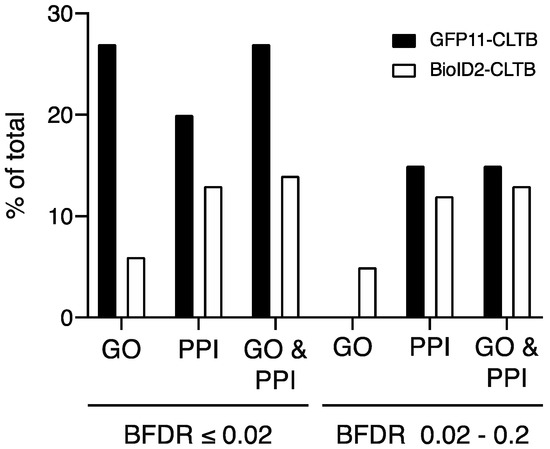To assess the biological relevance of the proteins identified, we compared the proteins identified by BioID to the list of human proteins annotated with clathrin-related GO terms and to the set of human proteins in the BioGrid database that interacted with either clathrin heavy or light chain. Although transiently expressed BioID2-clathrin light chain identified a larger number of proteins from either group, a higher percentage of proteins identified by GFP11-clathrin light chain were annotated with clathrin GO terms or interacted with clathrin compared to BioID2-clathrin light chain (27 and 20% vs. 6 and 13%, respectively; Figure 7 and Supplementary Table S4). In addition, a larger percentage of proteins with clathrin GO terms or that interacted with clathrin was present in the high confidence set of interactions from GFP11-clathrin light chain than among low-confidence interactions (27% vs. 15%, respectively). In contrast, the same percentage was observed in the high and low confidence sets from BioID2-clathrin light chain (14%). This suggests that non-specific interactions were more effectively filtered out of the highest scoring interactions using the GFP11 fusion approach.