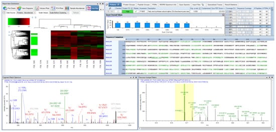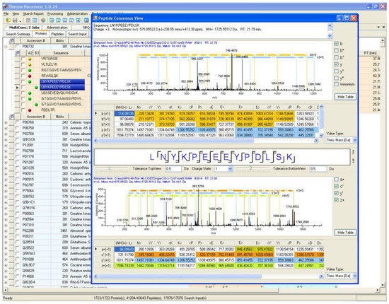 As software tools in proteomics continue to improve, particularly with the addition of more intelligently designed false discovery rate (FDR) estimation and filtering tools, it is tempting to trust identifications without verifying the spectra themselves. However, many of the most embarrassing retractions that have occurred in proteomics could have been prevented by the verification of the peptide spectral matches (PSMs) by trained mass spectrometrists [25,26,27]. For a more comprehensive discussion on the manual analysis of PSMs, please see the thoughtful review and tutorial by Dr. Simone König titled “spectral quality overrides software score” [28]. By placing the unaltered MS/MS spectra within easy reach at all times in its output interface, PD helps to ensure the validity of identifications made by automated tools. A screenshot of the PD 1.0 interface displaying this unchanged core philosophy of the program is shown in Figure 2.