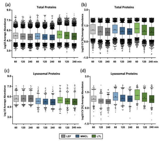 Figure 3. Reproducibility of protein abundance in DIA analyses. (a) Protein abundance for total proteins identified in individual samples with different gradient lengths. (b) CV values for total proteins identified in individual samples with different gradient lengths. (c) Protein abundance for lysosomal proteins identified in individual samples with different gradient lengths. (d) CV values for lysosomal proteins identified in individual samples with different gradient lengths. Shown are combined values from 3 replicates, the median is indicated by a line, while the average is marked with a “+”. LEF: lysosome-enriched fractions from mouse embryonic fibroblasts; MWCL: mouse embryonic fibroblast whole cell lysates; LTL: whole liver tissue lysate; CV: coefficient of variation.