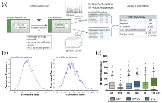 Due to the high number of peptides, we defined parameters for the acceptance of PRM quantification data without manual inspection of each peptide. Initially, we assessed the difference between predicted and experimentally observed retention times. For the 60 min and 120 min gradients, we observed average peak widths of 21 sec and 25 sec, respectively, and an average retention time variability of ±15 sec, with a slightly lower average shift for the 60 min gradients (Figure 5c). LEF analyses with 120 min gradients presented with only ±8 sec an exception, which might be due to the fact that we performed the PRM assay retention time normalization with 120 min gradient measurements of the LEF, while the scheduling for MWCL and LTL was solely based on iRT predictions.