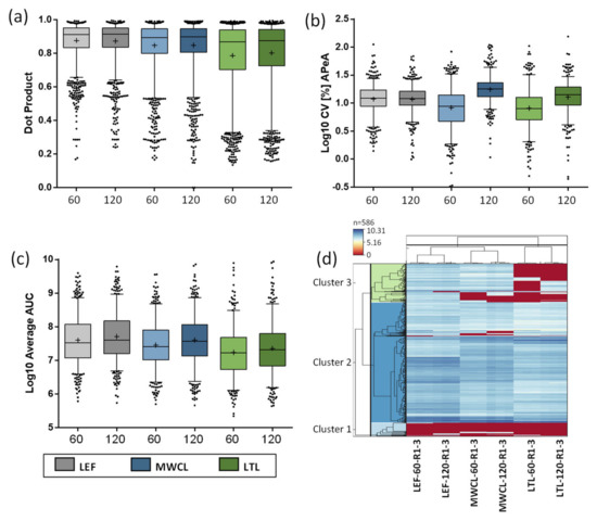 For LEF data, this cut-off resulted in an acceptance rate of 92% of the peptides included in our assay for both gradients. The value for MWCL was 87% for both gradients and for LTL 73% and 78%, for the 60 min and 120 min gradient, respectively. Applying these cut-offs, we exported the data from Skyline and utilized them for all further analyses (Table S4).