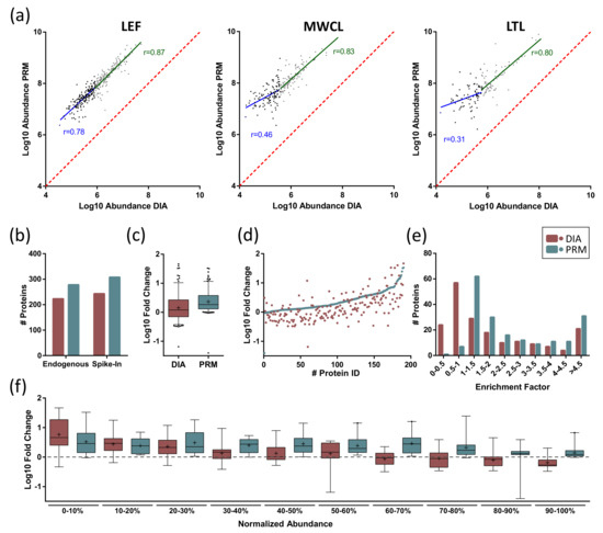 Figure 7. Comparison of DIA and PRM analysis of lysosomal proteins. (a) Correlation of normalized peptide signal intensities for DIA and PRM runs. Proteins are sorted based on their intensity in DIA measurements and grouped into two groups based on their intensity (upper/lower 50% of proteins). For each population, a linear regression analysis was performed and the respective correlation coefficient (r) is indicated. (b) Identification of proteins in LTL with and without spike-in of LEFs. (c,d) Fold change values for individual lysosomal proteins in LTL with spike-in of LEFs. (e) Frequency of proteins within distinct fold change quantiles for DIA and PRM data for ratios of LTL with/without spike-in of LEFs. (f) Protein fold change values for LTL with/without spike-in of LEFs. Proteins are grouped based on their abundance in the respective dataset relative to the highest/lowest-abundant protein. LEF: lysosome-enriched fractions from mouse embryonic fibroblasts; MWCL: mouse embryonic fibroblast whole cell lysates; LTL: whole liver tissue lysate.