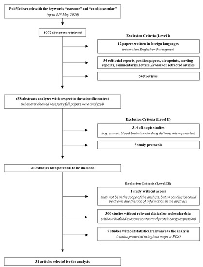 Aiming to explore all basic and clinical research studies on the interactions between exosomes and CVDs, a literature research was performed up to 31 May 2020 on PubMed using the keywords “exosome” and “cardiovascular”. A total of 1072 abstracts were retrieved and analyzed based on three levels of exclusion criteria (Figure 1, Table S1). For the first level, abstracts in other languages than English or Portuguese, editorial reports, position papers, viewpoints, meeting reports, commentaries, letters, erratas or retracted articles, and reviews were excluded. For the second level, off-topic abstracts and study protocols were excluded. Finally, the third level excluded studies in which access to relevant clinical or molecular data was not complete or studies in which statistical analysis was deemed inadequate. After analyzing the abstracts, 31 papers were validated for further evaluation. In order to extract proteins and miRNAs from exosomal origin and relevant to CVDs development, data from these articles were manually organized and each mediator was compared between healthy/non-diseased and diseased conditions.