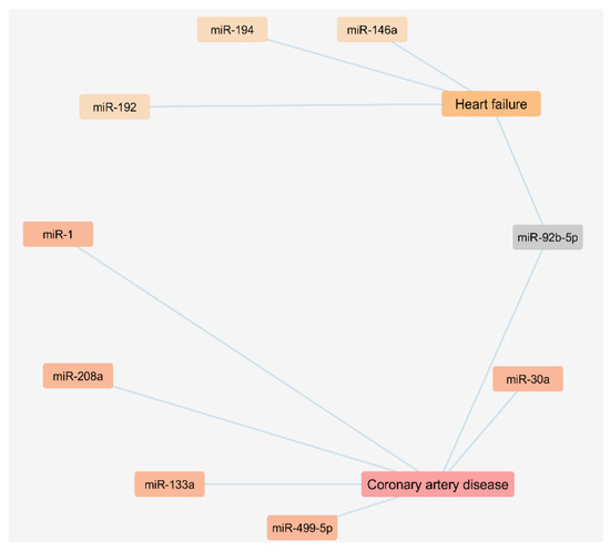 The performed literature search also enabled us to analyze a network regarding the exosomal miRNAs found to be up regulated in plasma or serum samples of CAD and HF patients as presented in Figure 2.