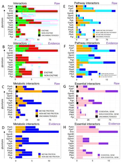 Overall, more metabolic than non-metabolic interactors were found in the glycolytic interactome, as expected, but the substantial number of non-metabolic interactors indicates an extensive crosstalk between glycolysis and other processes in bacterial cells.