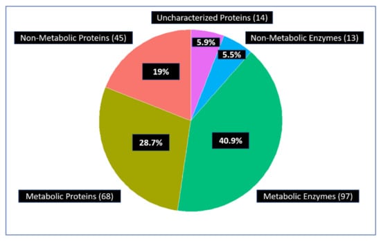 About 70% of the 237 unique interactors are metabolic enzymes or other metabolic proteins. These include 97 metabolic enzymes and 68 metabolic proteins but also regulators that control metabolism. The others are 45 non-metabolic proteins, 13 non-metabolic enzymes, and 14 uncharacterized proteins.