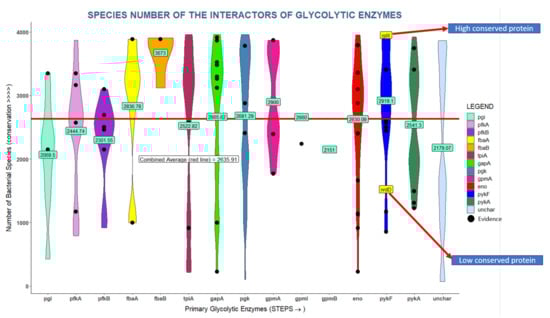 Glycolysis is a fundamental process found in all domains of life; hence glycolytic enzymes are highly conserved. We hypothesize that important interactors should be equally well conserved even though they could be conserved for other reasons. We found that glycolytic interactors are present in a large number of bacterial genomes ranging from 100 to 4000 out of 10,000 bacterial genomes [38] with an average of 2635 genomes (Figure 5). For instance, enolase has 35 interactors found in more than 3000 genomes but also 6 interactors found in fewer than 1000 genomes. Overall, glycolytic interactors seem to be better conserved than the average protein in the E. coli proteome, but much less conserved than any of the glycolytic enzymes which are almost universally conserved across bacteria.