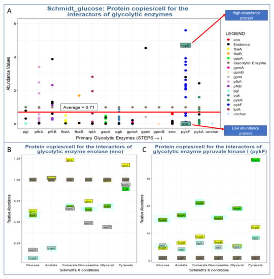 The flux of metabolic reactions is determined by the concentrations of enzymes and substrates, but also by their activities and their rate-limiting steps. Hence, we explored the abundance of the glycolytic proteome with respect to its interactome (Figure 7). We found that the abundances of glycolytic enzymes may be higher or lower than the abundances of their interactors (Figure 6). Even if an interactor binds with high affinity to an enzyme, that interaction will only have a noticeable impact on the enzyme if the interactor is present at a sufficient concentration. Hence, we estimate that ~70% of glycolytic interactors are not present in adequate amounts to have a significant impact on glycolysis. Interestingly, the concentration would be particularly critical for the rate-limiting enzymes, namely Pfk and Pyk [41], both of which are present as two isoforms (Figure 6). For a precise estimate, however, we would need measurements of binding affinity which are not available for the vast majority of interactions.