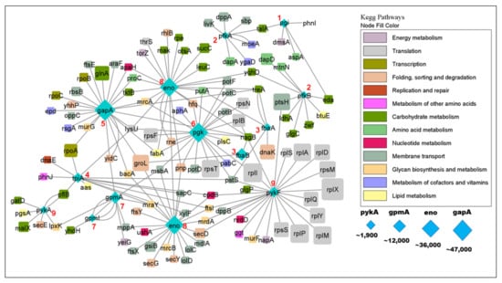 In order to identify enzymes among glycolytic interactors, we used the EC number in the Uniprot reference proteome [34]. Similarly, we used the Uniprot GO (Gene Ontology) terms to map proteins to biological processes, including “metabolic process” to find metabolic proteins or proteins not known to be involved in any metabolic pathway. This information was verified using annotations from KEGG [35] to identify proteins involved in carbohydrate metabolism or other processes, such as environmental information processing. Lastly, we identified essential genes/proteins using the Database of Essential Genes (DEG version 15.2) [36].