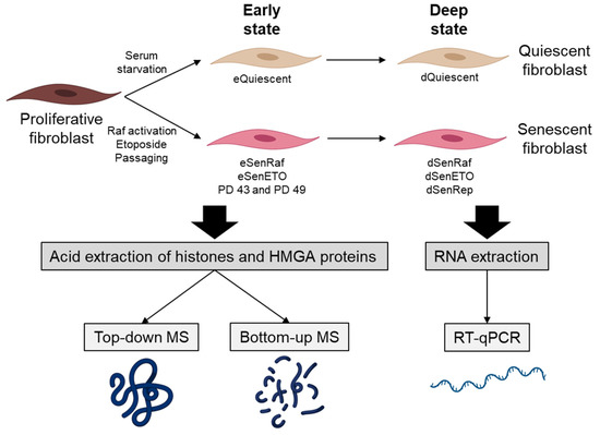 Overview of the study. WI-38 human fibroblasts were induced into quiescence by serum starvation or into senescence following Raf activation (SenRaf), etoposide treatment (SenETO), and passaging (Replicative senescence, SenRep). These various states of cell arrest were maintained for 5 days (early state) or 20 days (late state) and histones and HMGA were analyzed by mass spectrometry and RNA by RT-qPCR. Each condition was analyzed in triplicates except replicative senescence in duplicate. PD: population doubling.