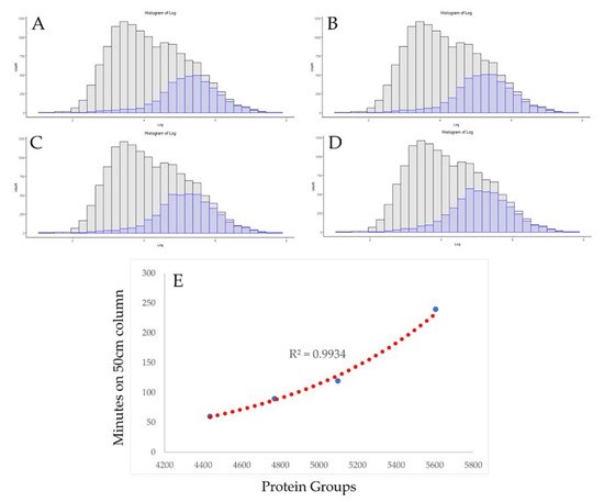 Visualizing diminishing returns in gradient extension. The distribution of protein copy numbers on an Orbitrap Fusion Lumos with the same chromatography conditions and utilizing the instrument’s highest scan acquisition rates with a total gradient length of 60, 90, 120, and 240 min (A–D, respectively). (E) A plot of the number of proteins identified versus total gradient time demonstrating the exponential increase in run time required to improve coverage under these conditions.