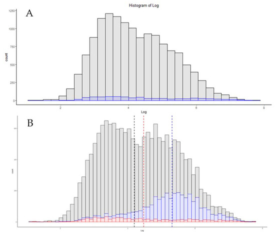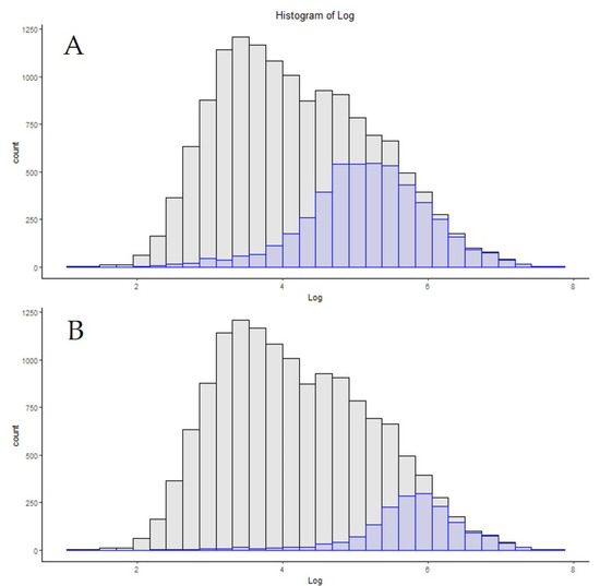 (A) The distribution of SomaScan 1300 targets by copy number by count. (B) Comparison of this distribution against a recently published 21 min method utilizing an Exploris 480 equipped with FAIMS with 60 bins utilized to increase the granularity of visualization.