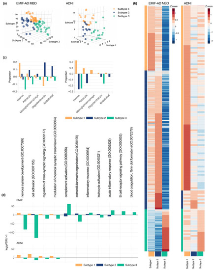 (a) Subject scores which reflect how well they match each of the three subtypes, individuals were assigned to the subtype on which they showed the highest loading; (b) protein levels averaged across individuals for each subtype (see Supplementary Table S5a,b for statistics of protein level comparisons between subtypes); (c) proportion of subtype-specific proteins that were labelled to be specific for a particular cell type (left: EMIF-AD MBD; right: ADNI); (d) selection of pathways enriched for subtype-specific proteins (see Supplemental Table S6 for complete list of enriched pathways). For (c,d): bars going up represent pathways associated with increased proteins, bars going down represent pathways associated with decreased proteins, and in (d) absolute numbers represent log(pFDR) * −1, * is times.