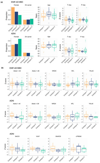 The following are available online at https://www.mdpi.com/article/10.3390/proteomes9030036/s1, Table S1: Average (SD) protein levels for AD groups, Table S2: Fit statistics of solutions for increasing number of clusters (2 to 5), Table S3: Descriptive comparison of individuals who were excluded from EMIF-AD MBD due to outlying values on cluster loadings, Table S4: Overlap of AD and controls for proteins that differ between subtypes, Table S5: Average protein levels according to subtypes, comparisons amongst subtypes, and cell type production assignment, (a) in EMIF-AD MBD, (b) in ADNI, Table S6: GO biological pathway enrichment, Table S7: Transcription factor enrichment, Table S8: Proportions or estimated marginal means (se) for biomarker comparisons from Figure 2.