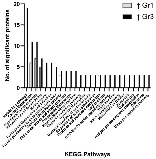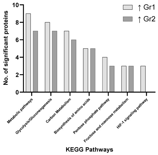 Focusing on the group 1 vs. group 3 comparison, more proteins associated with metabolic pathways, carbon metabolism, glycolysis/gluconeogenesis and biosynthesis of amino acids were discovered to be elevated in group 3 (Figure 1). Of the proteins identified as significantly changed between group 1 and group 3, those involved in propanoate metabolism, oxytocin signaling pathway, pyruvate metabolism, regulation of the actin cytoskeleton, nucleotide-binding oligomerization domain (NOD)-like receptor signaling pathway, tight junctions, hypoxia-inducible factor 1 (HIF-1) signaling pathway, apoptosis and the glucagon signaling pathway were uniquely associated with group 3. Overall, the majority of proteins were found to be significantly elevated in group 3 compared to group 1 (56 proteins vs. 8 proteins) (Figure 1, Figure 2 and Figure 3).