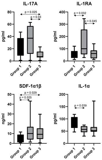 Box and Whisker plots for IL-17A, IL-1RA, SDF-1α1β and IL-1α based on results from serum biomarker analysis using targeted multiplexed immunoassays.