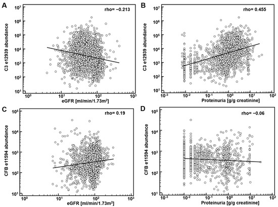 Estimated glomerular filtration rate (eGFR) was calculated from serum creatinine using the Chronic Kidney Disease Epidemiology Collaboration (CKD-EPI) equation [24]. Complement peptides in urine are in part the result of glomerular filtration, and in part the result of proteinuria, and both of these processes contribute to the final abundance of urinary peptides. Thus, to correct for proteinuria (g/g creatinine) (specifically the fraction of peptides being a result of the proteinuria), impact of proteinuria on the complement abundance was estimated, and then subtracted from the peptide abundance. In brief, first, the relative abundance of all peptides originating from the same protein was summed up (“combined abundance”). This approach is further justified since most peptides observed are from the same region of the respective complement protein, and hence, are mutually exclusive (only one of these specific peptides can be generated per one complement molecule). The data were log transformed and correlation of the combined abundance with log proteinuria was assessed. Specifically, from the regression equation ((combined abundance) = a + b × (proteinuria)), the value of “b”, representing the impact of proteinuria on the abundance of complement peptides in urine, was first determined. This analysis was performed separately for each complement protein. Subsequently, the respective value of “b” was applied for each respective peptide as follows: (log peptide relative abundance corrected) = (log peptide relative abundance observed) – b × (log proteinuria).